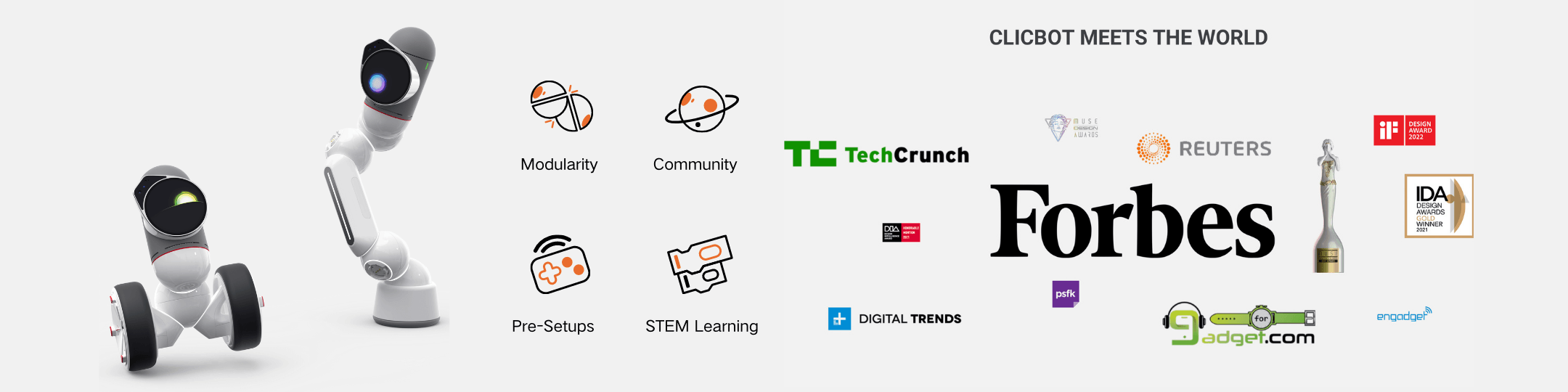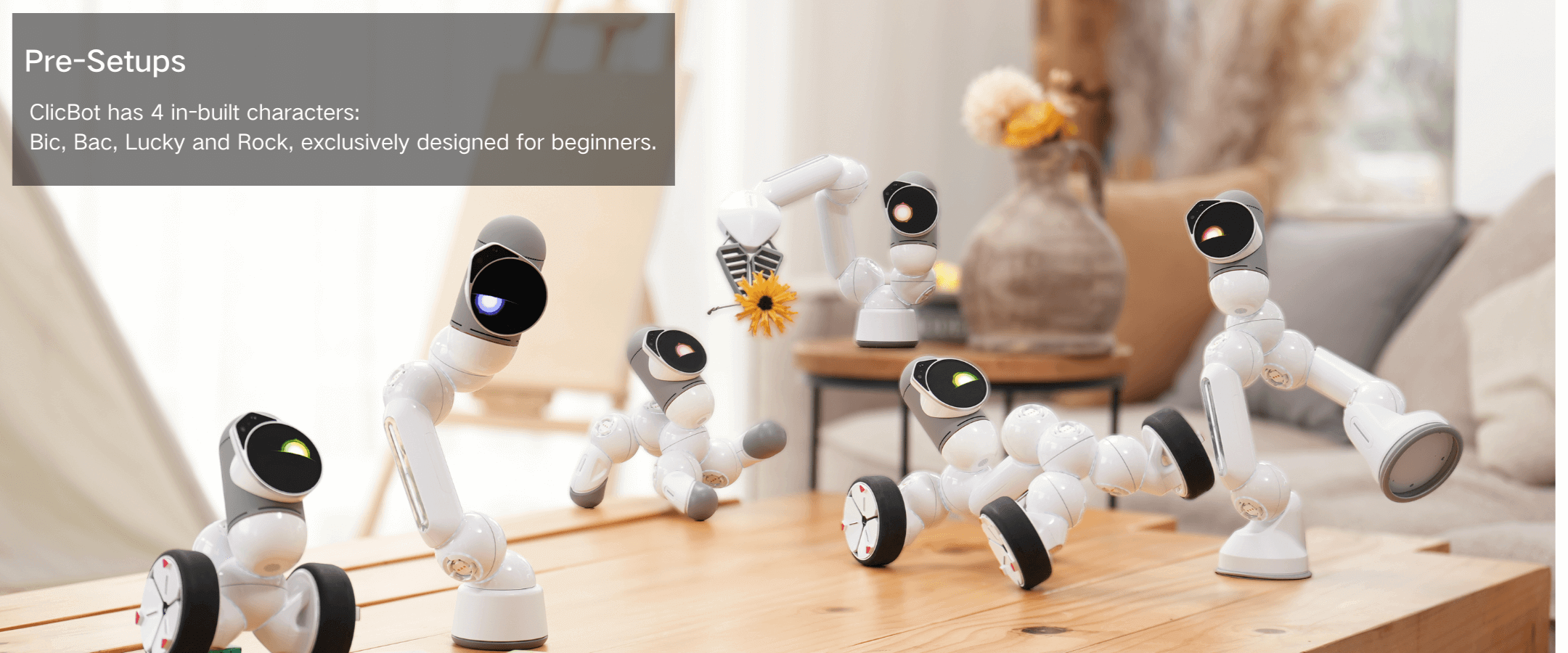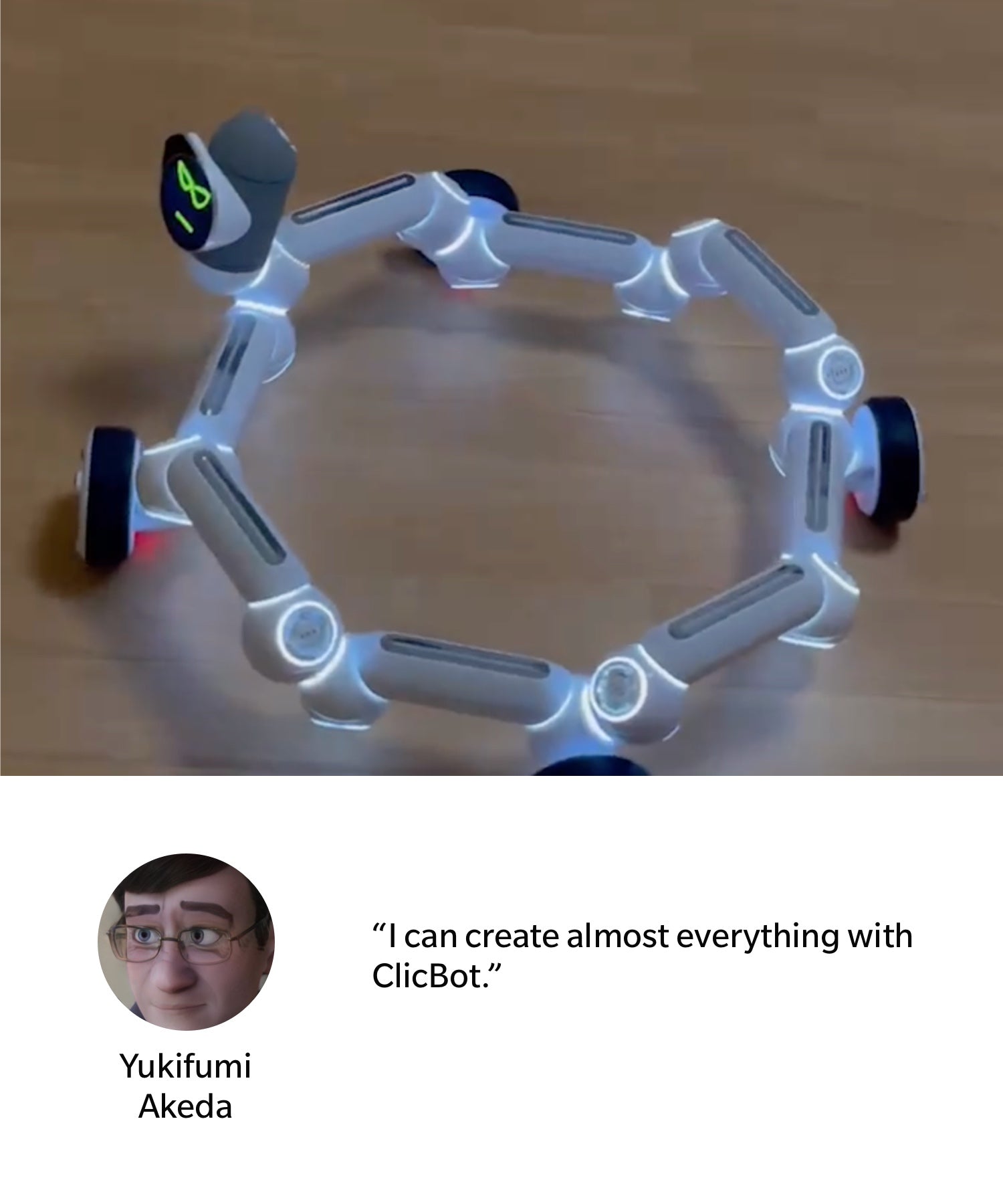ClicBot adds more fun to family time. You'll find it hard not to be charmed by this robot's contagious personality and unique modular design. ClicBot is a delightfully engaging robot friend that can get you and your family hooked on discovering fun ways to play!