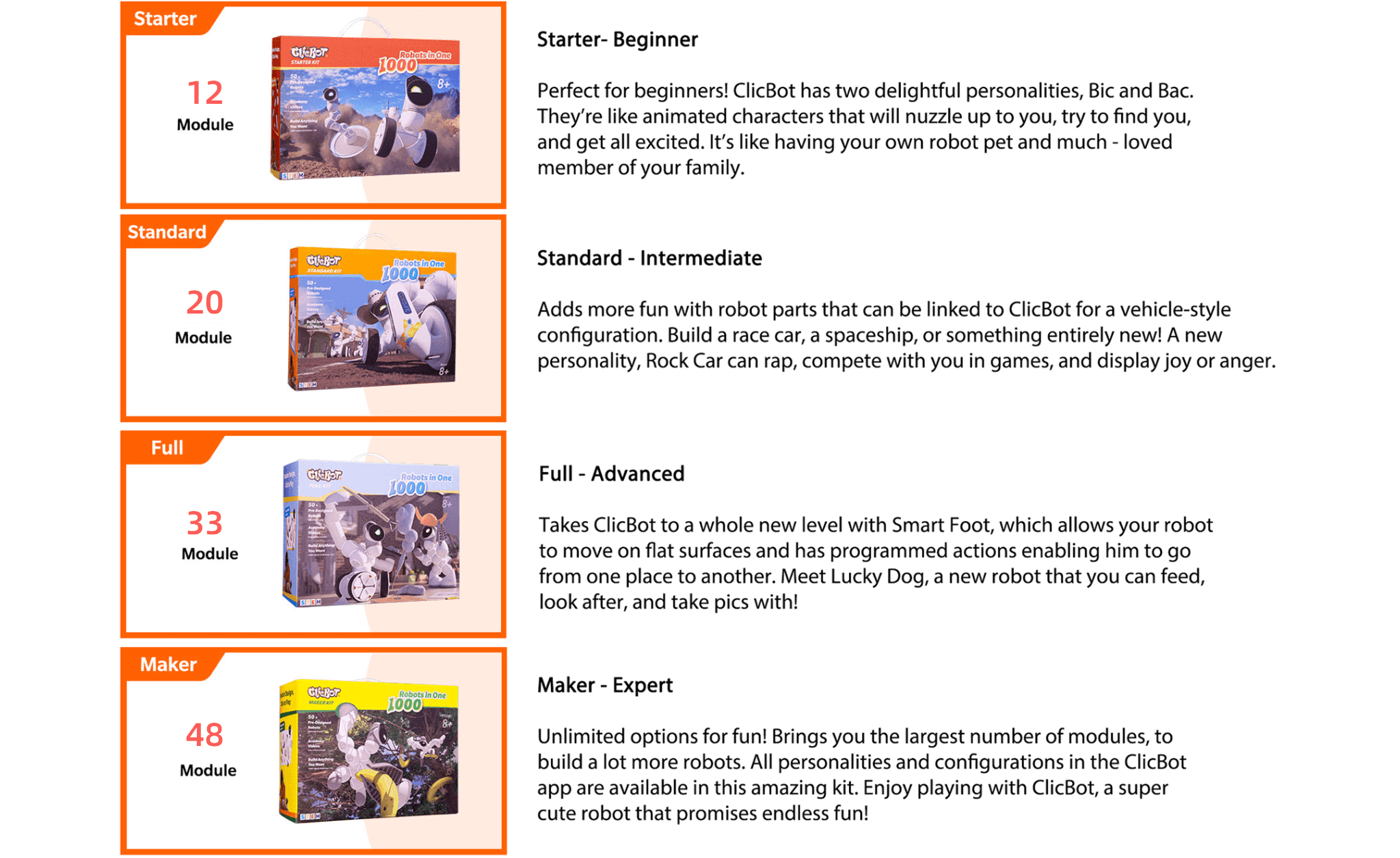 You can buy any parts of ClicBot the first time and you can also buy a ClicBot kit as well as accessories to expand your kit.